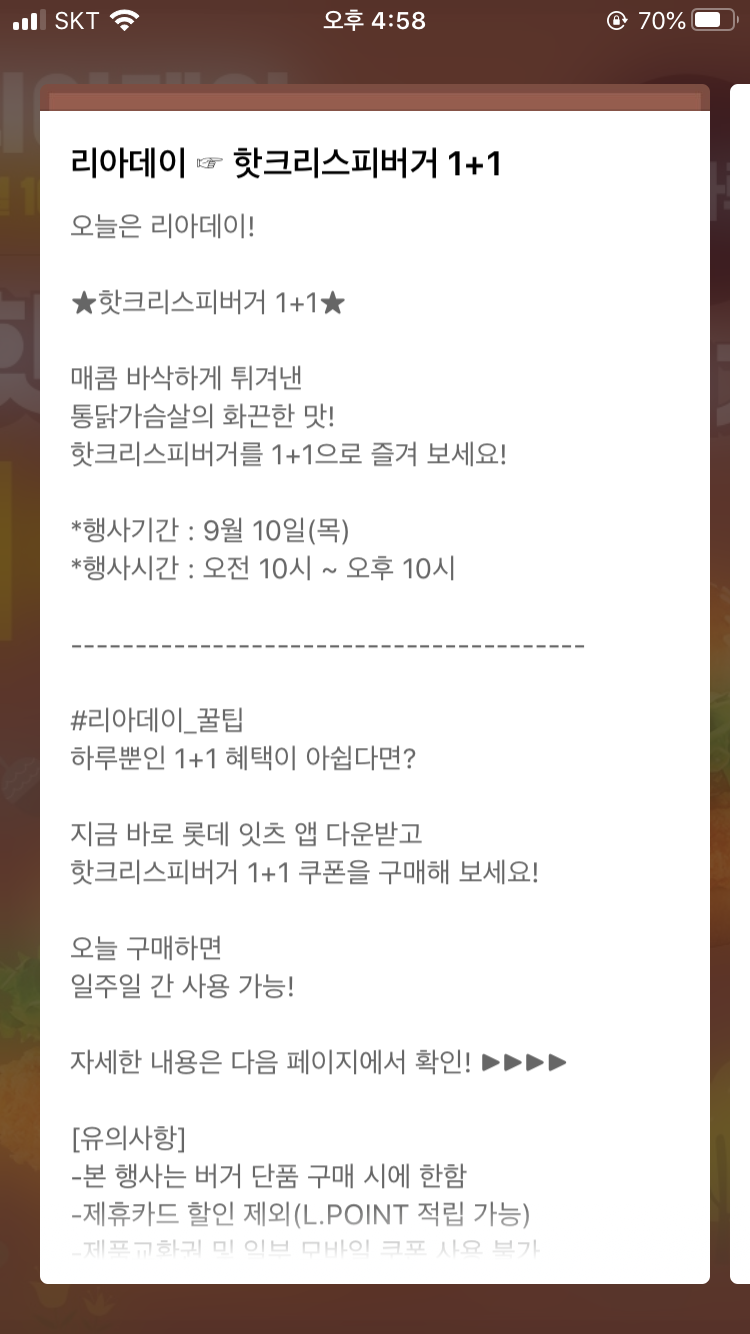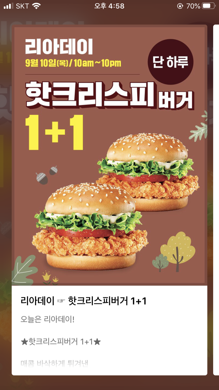 롯데리아에서 핫크리스피 버거를 1+1한다는 이벤트 카톡이 도착했습니다!