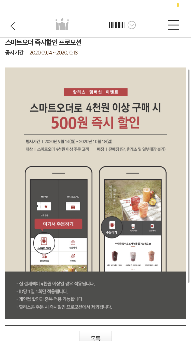 단, 할리스커피 어플에서 스마트 오더로 주문할 때에만 할인을 받으실 수 있습니다.