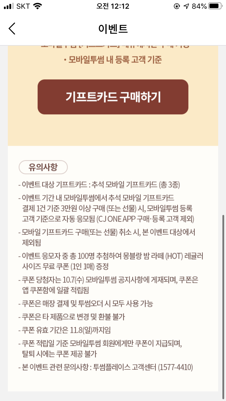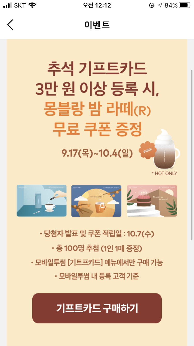 투썸 플레이스는 '추석 기프트카드'를 구매 시에 이벤트에 참여할 수 있습니다.