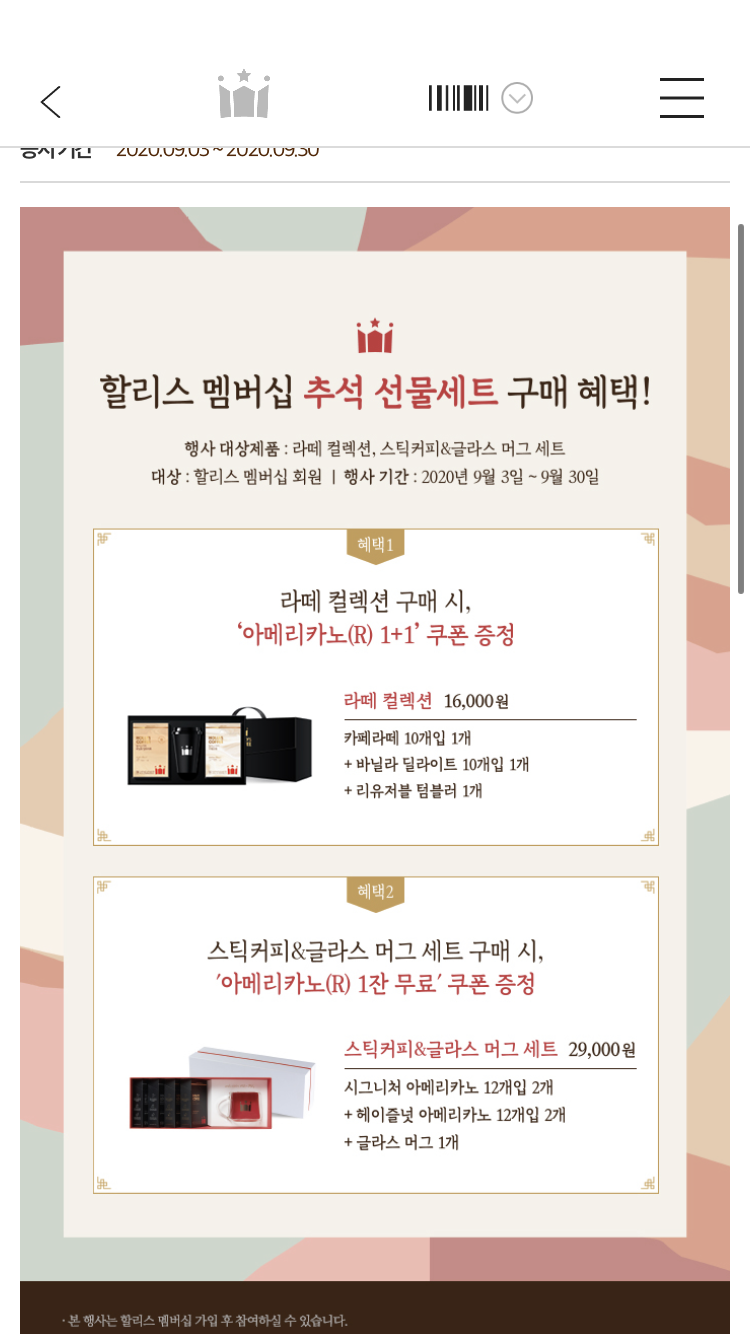 할리스 커피는 총 두 가지 상품에 대해서 이벤트를 진행하고 있으며