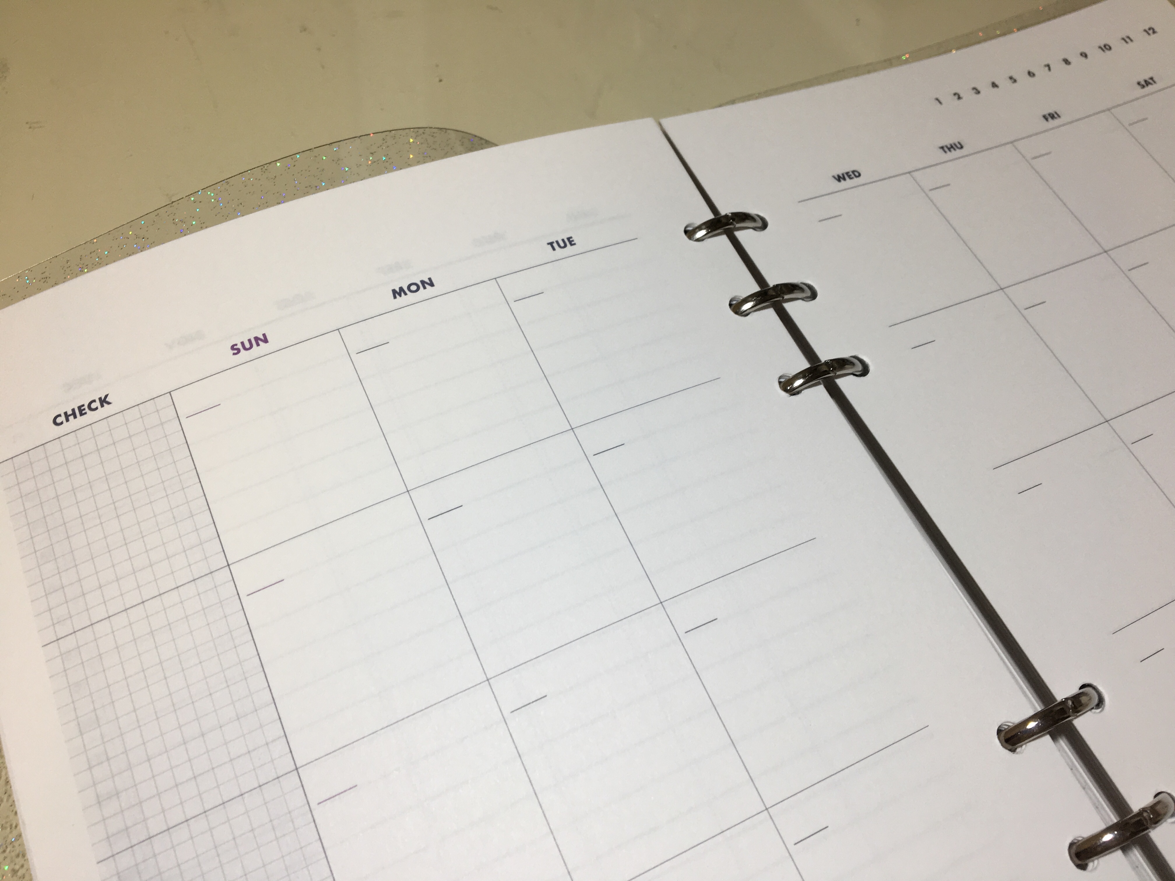 각 속지는 한 달->한 달->...->한주-> 한주->...->모눈종이 순서대로 배치되어 있습니다.