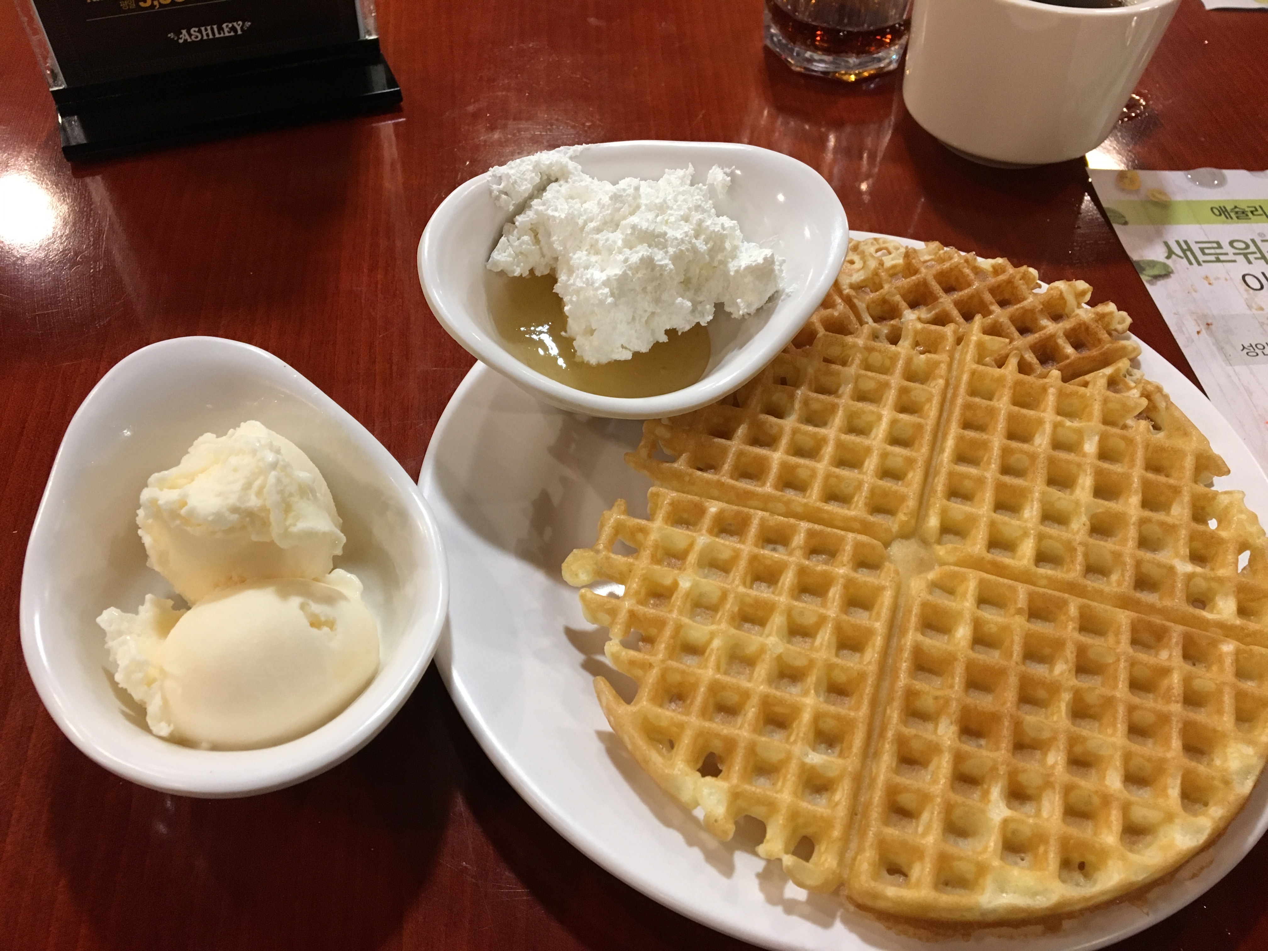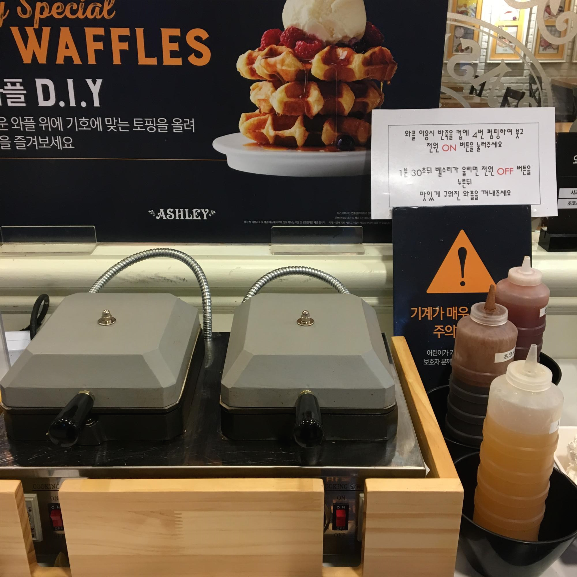 애슐리에는 와플 기계가 샐러드바에 위치해 있어 직접 와플을 만들어 먹을 수 있습니다. 안내사항대로만 한다면 쉽게 만들 수 있습니다.