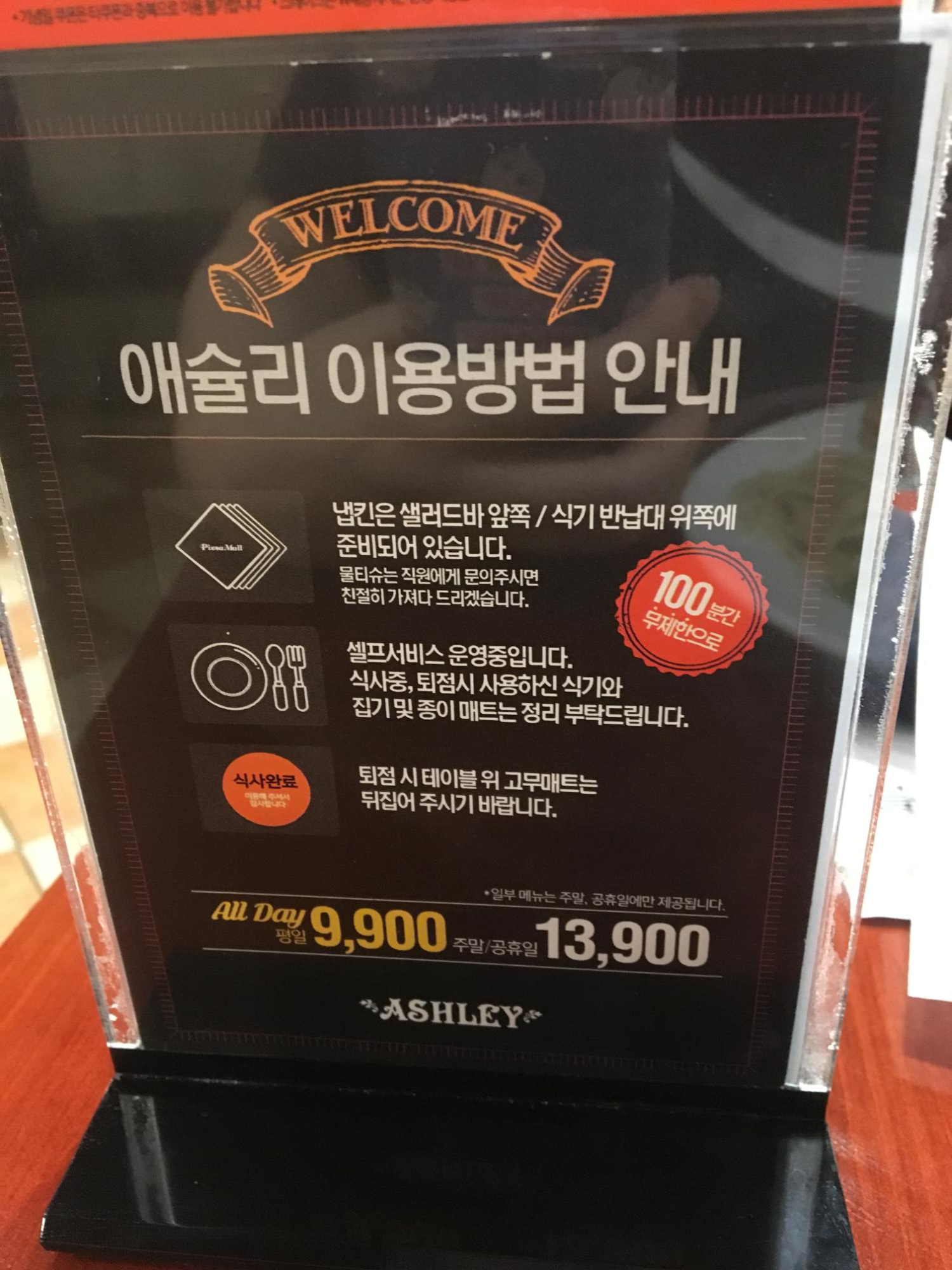 애슐리 클래식은 평일에는 하루 종일 9900원이며 주말과 공휴일에는 13900원이라는 착한 가격의 뷔페입니다.