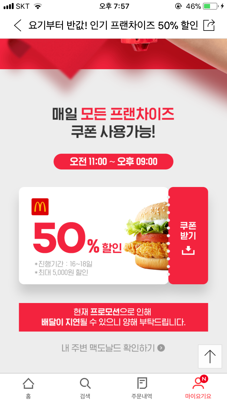 그러니 여러분들은 혹시 이 요기요 행사를 통해서 맥도날드를 드실 예정이시라면 드시고 싶은 시간의 두 시간 전에 주문하는 것을 추천드립니다.
