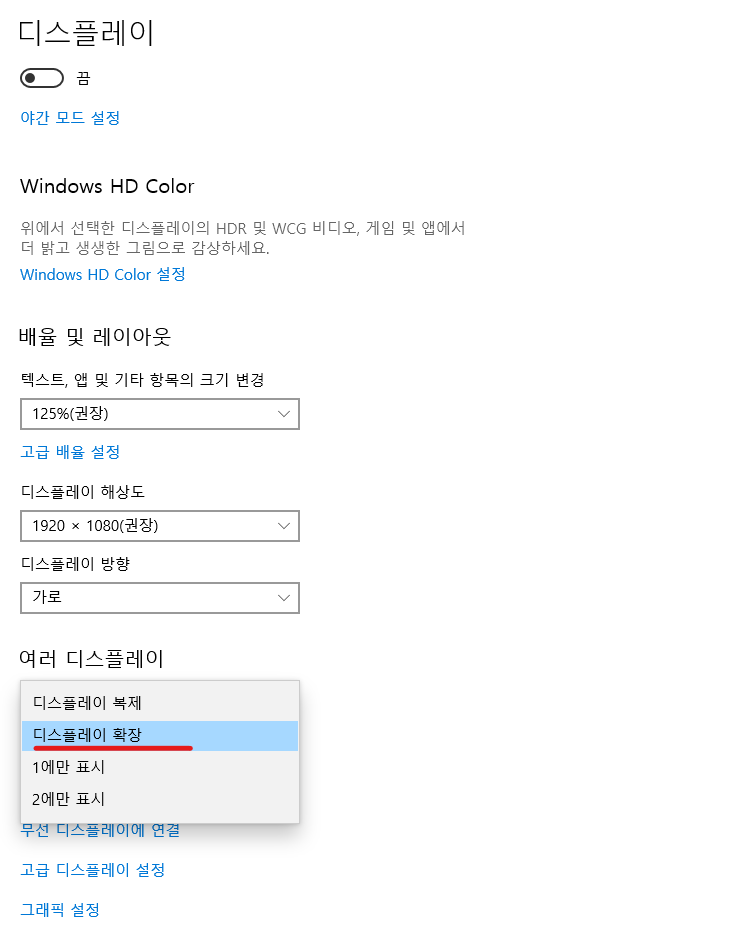 제 경우에는 디스플레이 확장을 원했기 때문에 그걸로 설정해 주었습니다.