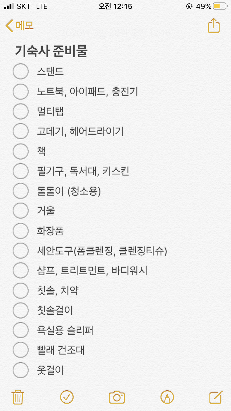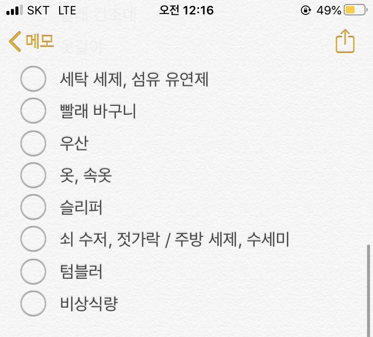 제가 실제로 기숙사에 들어갈 때 체크하면서 챙기려고 핸드폰 노트에 직접 적은 리스트입니다.ㅎㅎ